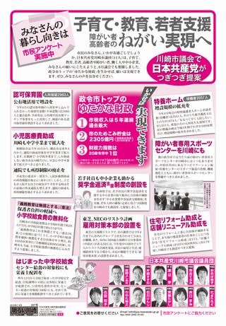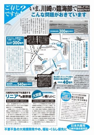 「みなさんの暮らし向きは」市民アンケート実施中。子育て・教育、若者支援、障がい者・高齢者のねがい実現へ、川崎市議会で日本共産党がつぎつぎ提案。政令市トップのゆたかな財政(1,市税収入は5年連続過去最大、2,市のためこみ貯金は2305億円、3,財政力指数は20政令市中1位)をいかせば実現できます。ご存知ですか?いま、川崎の臨海部で税金ムダづかい、安全おびやかすこんな問題がおきています。大問題!川崎市内の地下を通過するリニア中央新幹線があきらかに。事故時の安全確保=具体化なし。土地利用の制限など地権者に損害も。武蔵小杉のまちづくり。マスコミも相次ぎ報道。駅の異常混雑、早急に安全対策を。