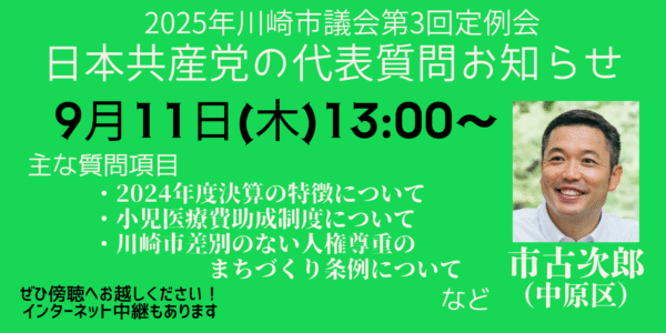 2025年9月11日の川崎市議会定例会で、市古次郎議員が代表質問を行いました。主な内容は以下の通りです。