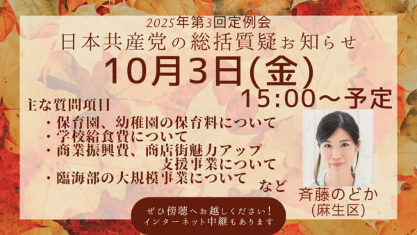 2025年10月3日の川崎市議会定例会で、齋藤温議員が総括質疑を行いました。主な内容は以下の通りです。