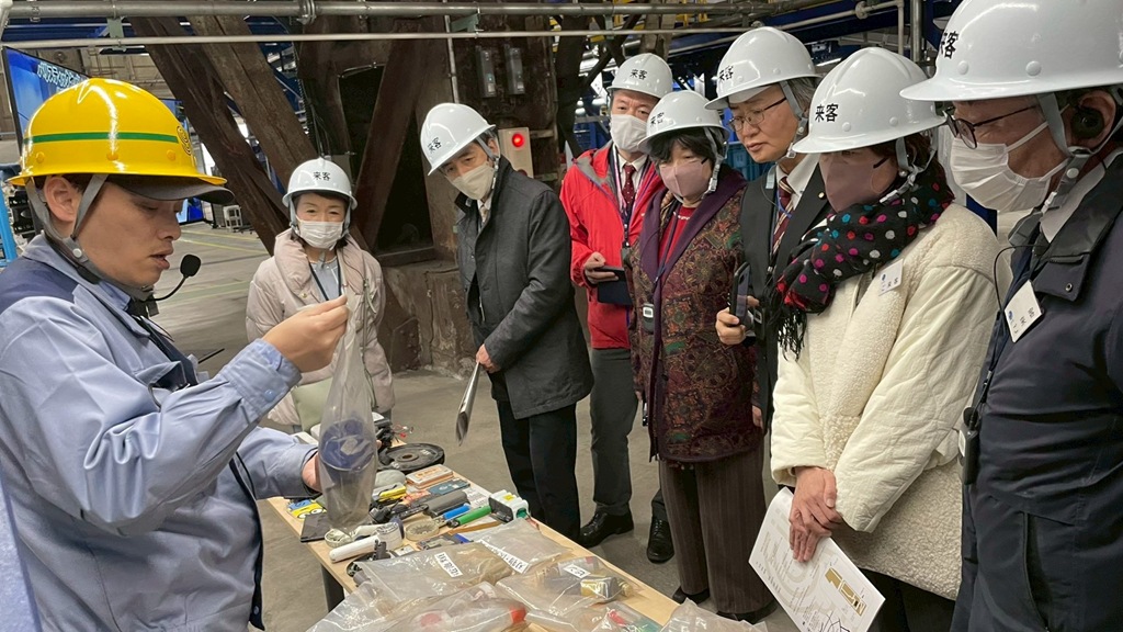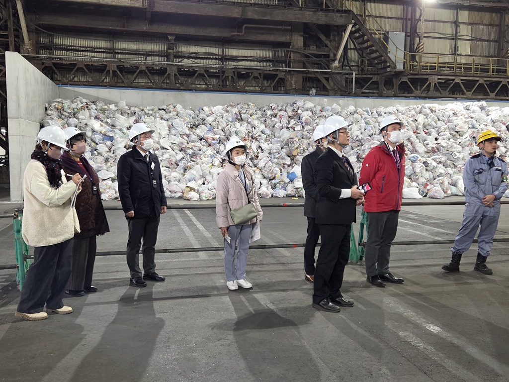 Jサーキュラーシステムは、民間事業者から排出される産業系使用済みプラスチックとプラ新法に基づき自治体が回収する家庭系使用済みプラスチック双方を受け入れ、リサイクラーが利用しやすいリサイクルプラスチック原料を製造するというリサイクルシステムとのことでした。その後、施設を見学させていただきました。広大な屋内にプラシチックごみが運ばれてきて、選別をし、再生ペレットやコークスなどにリサイクルしていく様子を見学しました。